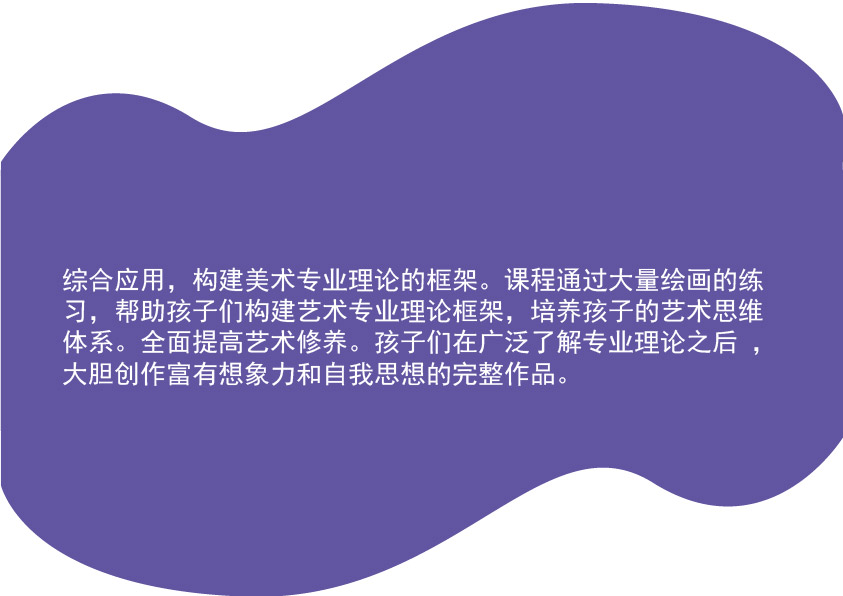 教学目标:综合应用,构建美术专业理论的框架。课程通过大量绘画的练习,帮助孩子们构建艺术专业理论框架,培养孩子的艺术思维体系。全面提高艺术修养。孩子们在广泛了解专业理论之后,大胆创作富有想象力和自我思想的完整作品。